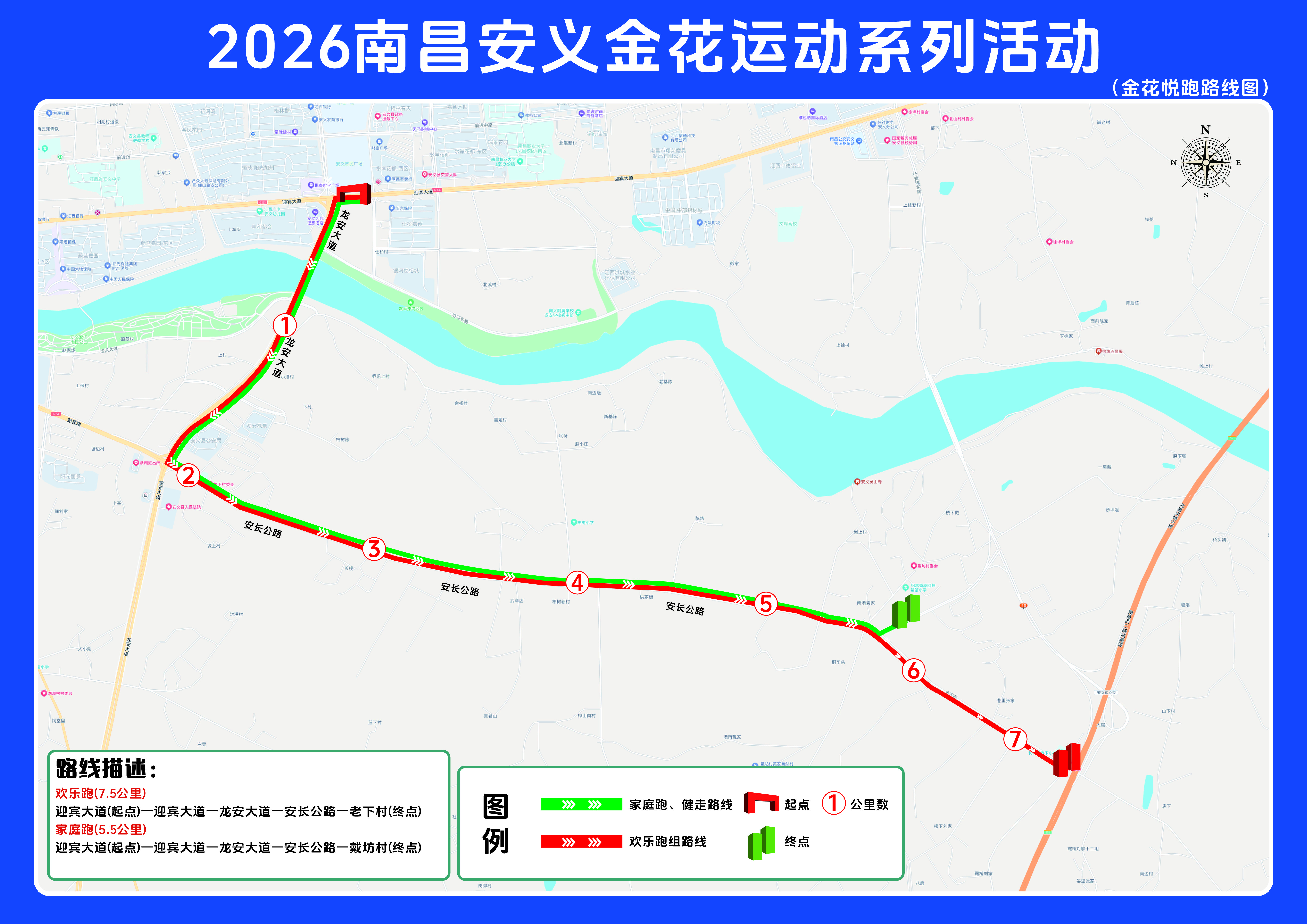 (1)欢乐跑:凤山大道与迎宾大道交汇口→安义大桥→迎宾大道→龙安大道→安长公路→江下村(终点),全程约7.5公里